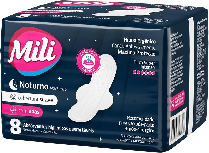 Cuidados DiáriosLinha FemininaAbsorventesAbsorvente Mili Noturno Intenso Suave com Abas 24 Unidades
