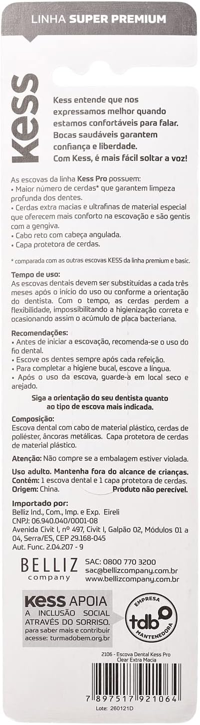 Escova Dental Kess Pro Clear Extra Macia Cores Sortidas com 1 Unidade+ Capa Protetora